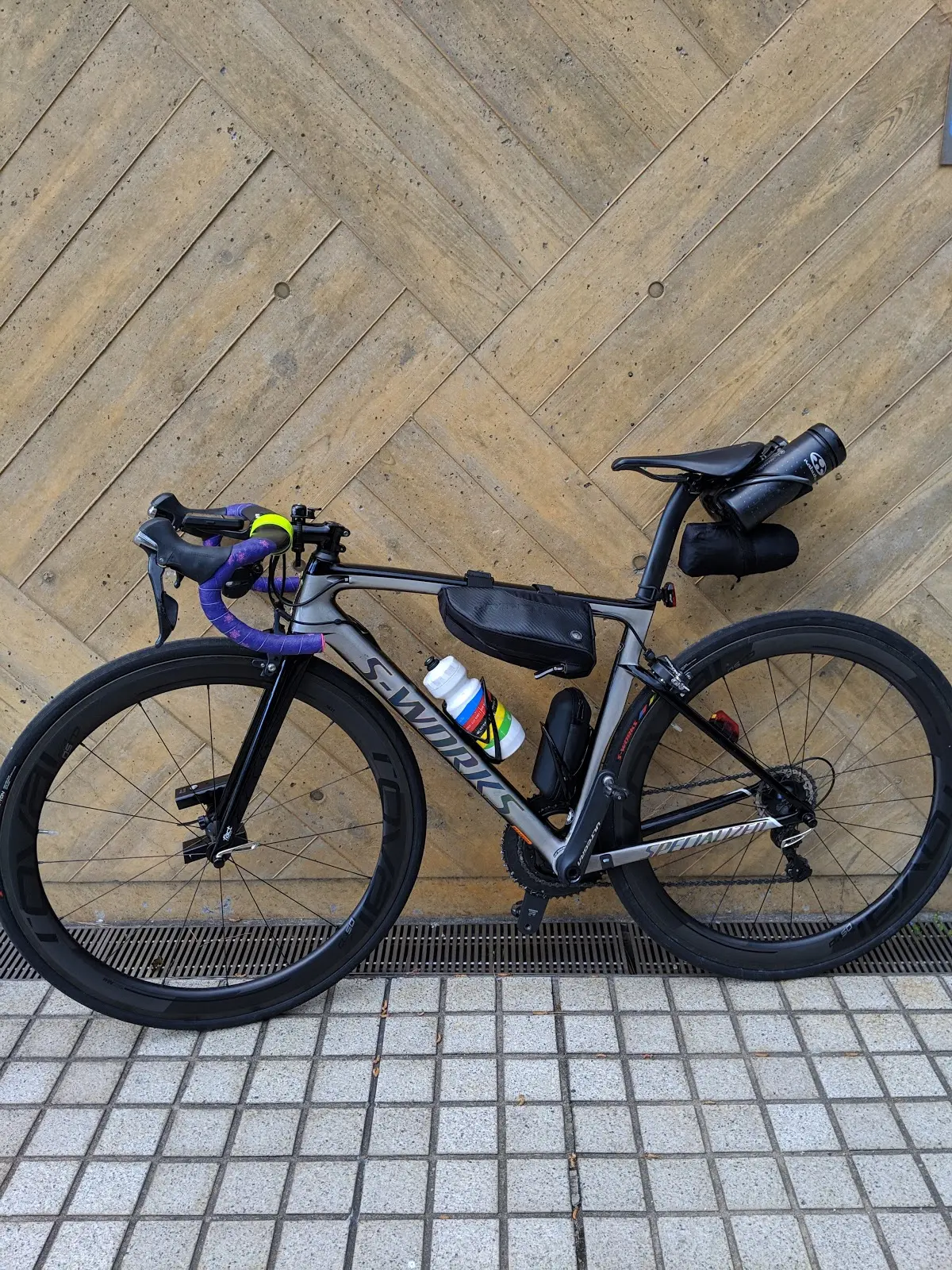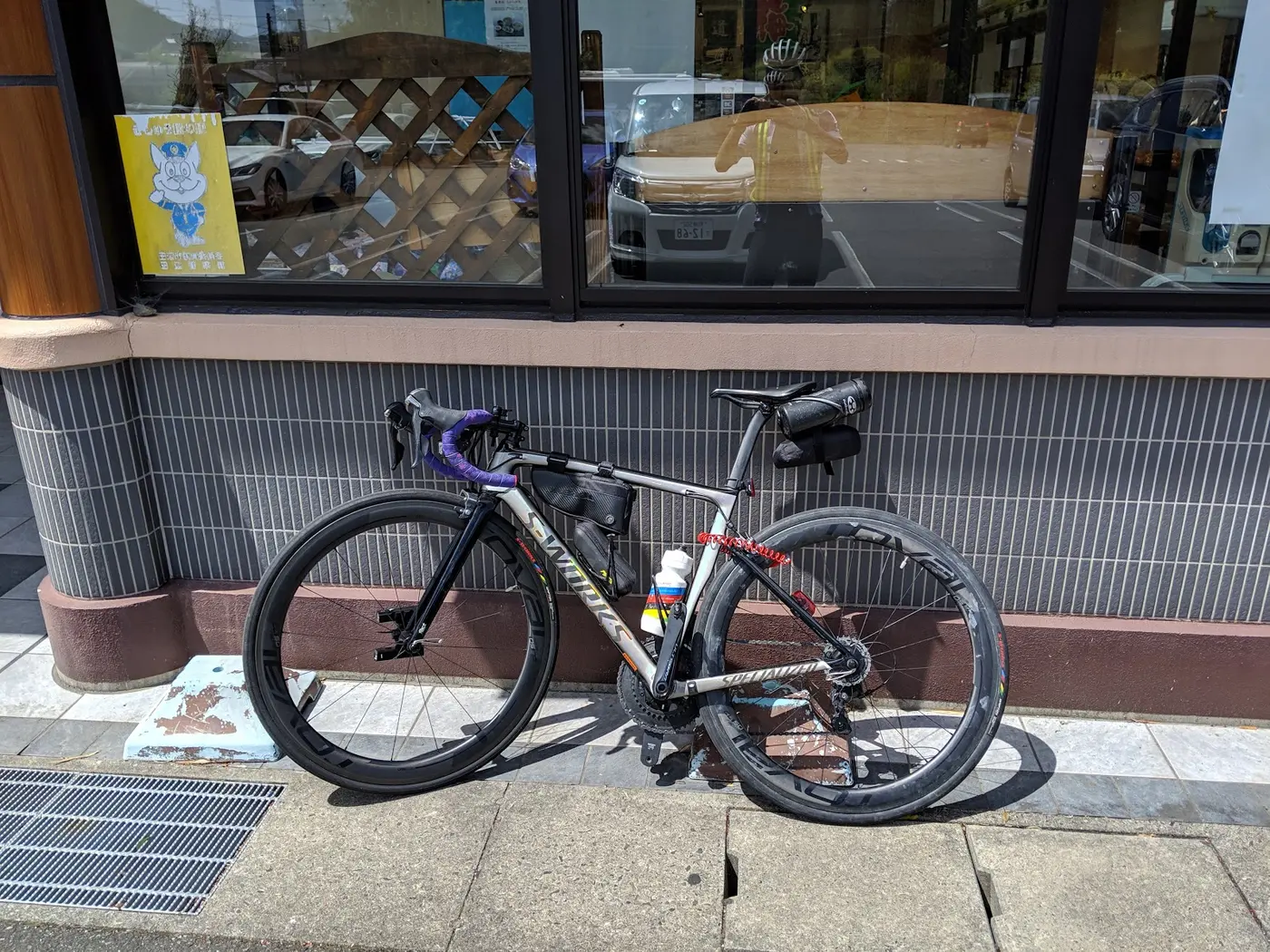 かつてブルベについて調べた時、ツワモノたちはコンビニの前の駐車場やコインランドリー、精米所などで眠るという情報を目にしたことはあった。UGはそれを都市伝説だと思っていた。いくら屈強なランドヌールにも人権はあるはずだ!冷たいアスファルトの上で眠るなんて正気の沙汰じゃない。きっと彼はコンビニの中のイートインスペースで寝るんだと思うことにして先へ進む。進んでるときにもう一度考えたけどあのコンビニイートインスペース無いんだよなぁ...。健脚兄貴と別れてから5kmほど進むと実質ラスボスとも言える登りが2つ現れる。最初の登攀が由良峠。そしてこの由良峠の登り口の駐車場でUGは二度と忘れない光景を目にする。信号待ちで止まった横に駐車場があったのです。そこにこんな田舎では絶対お目にかかれないようなロードバイクがフェンスに立てかけられている。そしてその横に横たわるレーパン姿の男...