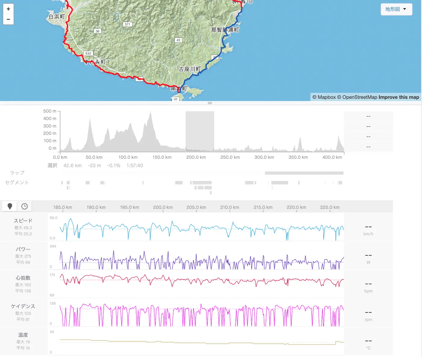 幸い新宮から串本までの30kmは追い風だったため対して力を使わずに25km/h ~