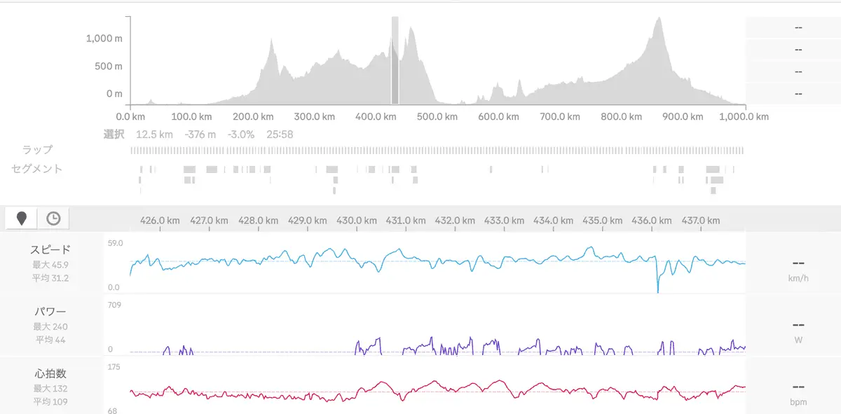 2日目、300km走ってからの100kmのペースが脅威の100km/4.5時間である。
