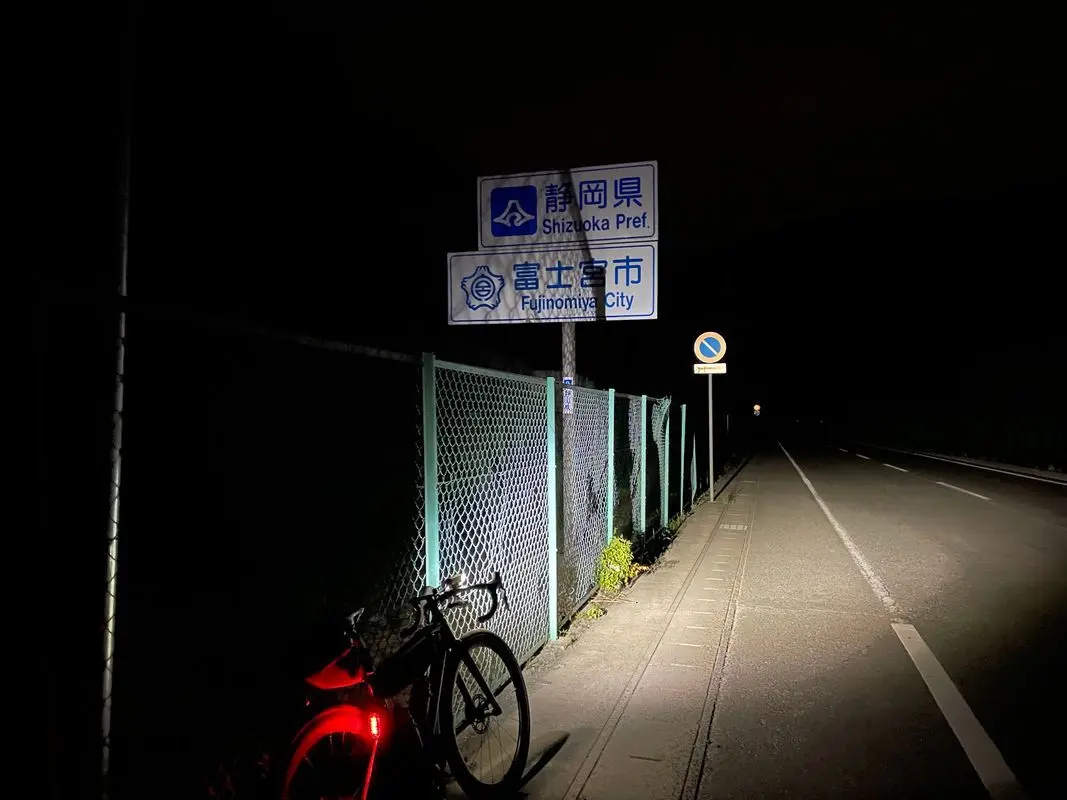 真っ暗闇の中を抜けてきたので時間の感覚も無い。だた距離だけが認識できる時間の代替として機能している。 ここまで数十キロに渡って走ってきた富士川から離れる時がきた。沼津から静岡に抜ける時に何度も通った道に出る。